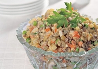 Если говорить о праздничном новогоднем столе, то первое что приходит в голову – салат «Оливье», «Винегрет» и «Шуба». Действительно какой же Новый Год без традиционного Оливье. За всю историю кулинарии насчитывается огромное количество вариаций данного салата, и это несмотря на то, что его состав достаточно прост и имеет стандартный набор ингредиентов. Традиционно Оливье готовится с яйцами, солеными огурцами и горошком. Мы же хотим поделиться с вами рецептов салата «Оливье» с мясом, а именно свининой. В состав этого новогоднего салата также входит картофель, лук, яйца, горошек и соленые огурчики. Последние можно заменить на корнишоны – они поменьше и имеют приятный сладковатый вкус, что придаст вашему Оливье пикантный вкус.